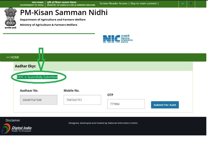 7. सही OTP दर्ज होने पर EKYC is Sucessfully Submitted का संदेश दिखने लगेगा।
